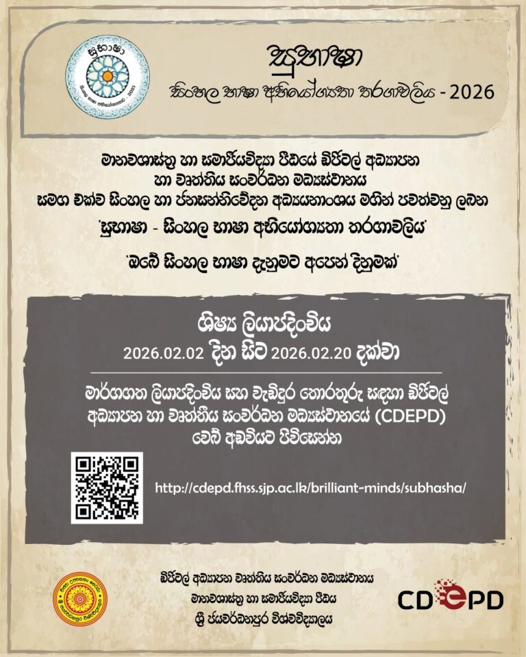 ශ්රී ජයවර්ධනපුර විශ්වවිද්යාලයේ මානවශාස්ත්ර හා සමාජීයවිද්යා පීඨයෙහි ඉගෙනුම ලබන අභ්යන්තර විද්යාර්ථියකු වීම.