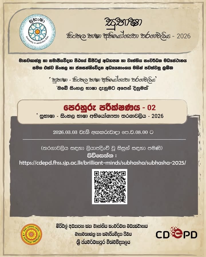 මානවශාස්ත්ර හා සමාජීයවිද්යා පීඨයේ ඩිජිටල් අධ්යාපන හා වෘත්තිය සංවර්ධන මධ්යස්ථානය සමඟ එක්ව සිංහල හා ජනසන්නිවේදන අධ්යයනාංශය මඟින් පවත්වනු ලබන සුභාෂා සිංහල භාෂා අභියෝග්යතා තරගාවලිය – 2026 ශිෂ්ය ලියාපදිංචිය :- 2026/02/20 දින සිට 2026/02/20 දින දක්වා වැඩි විස්තර සඳහා cdepd.fhss.sjp.ac.lk/ වෙත …